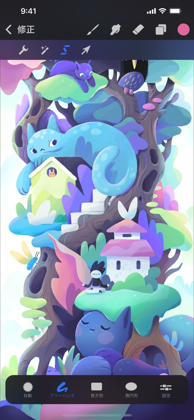 Procreate Pocket では、フリーハンドによる選択を終了する方法が複数あります。次に行いたいアクションに応じて、以下のいずれかの方法で選択を終了できます。