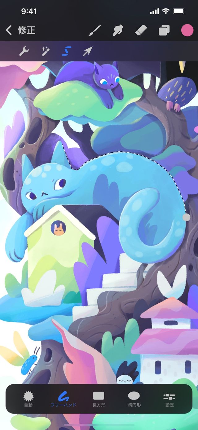 選択したい部分を手描きの線で囲むことによって、選択範囲を直感的に指定することができます。フリーハンドで描画して選択範囲を作成したり、タップして折れ線を描いたり、両方を組み合わせて複雑な形状を作成したりすることができます。