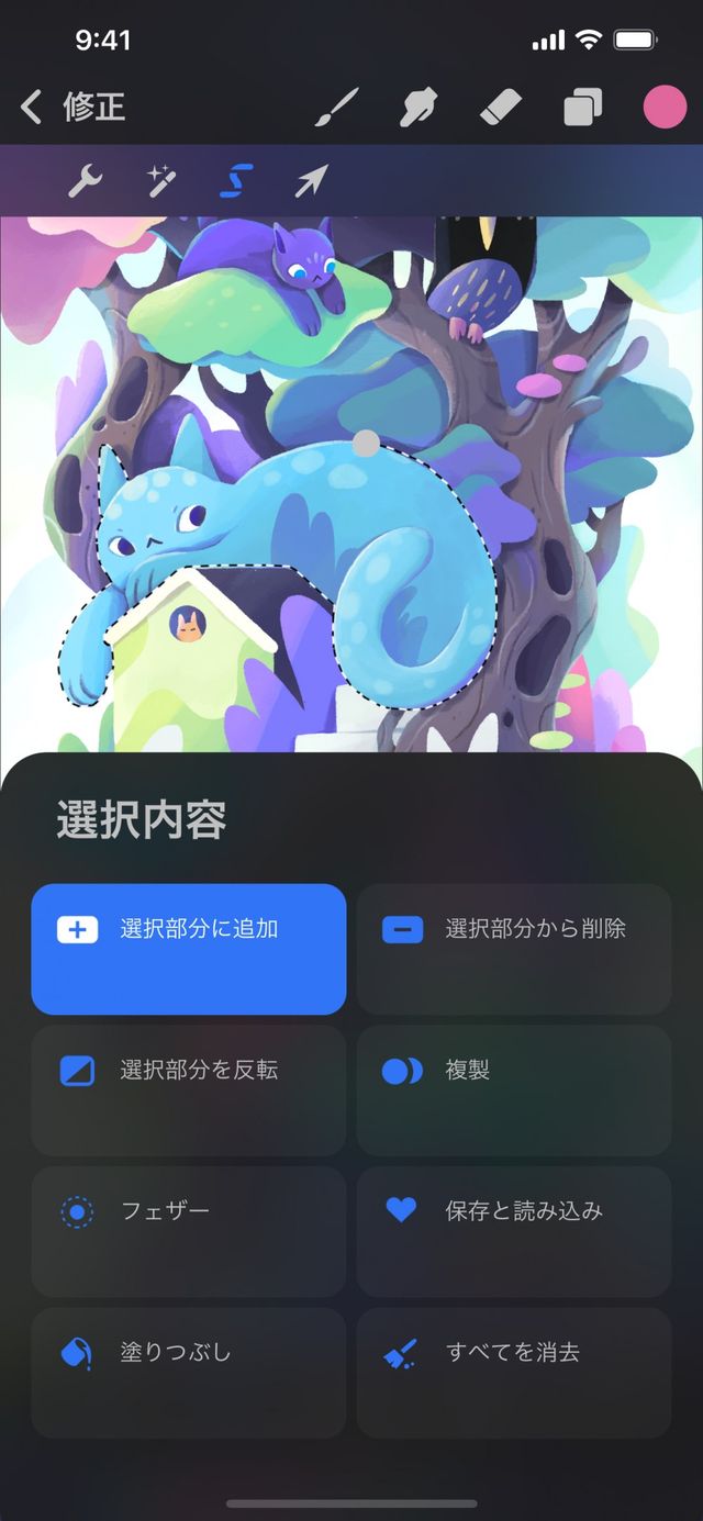 選択機能を使って、アートワークの特定の領域を分離し、その領域にさまざまな編集操作を行えます。選択領域の外部にある内容に影響を及ぼすことなく、選択領域だけを対象に、ペイントや、ぼかし、消しゴム、塗りつぶし、変形操作を行えます。