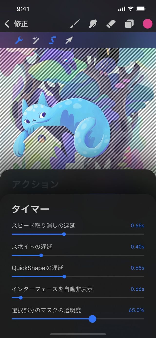 修正 > アクション > 環境設定 > タイマー に移動します。メニューの下部に、“選択部分のマスクの透明度” のスライダがあります。