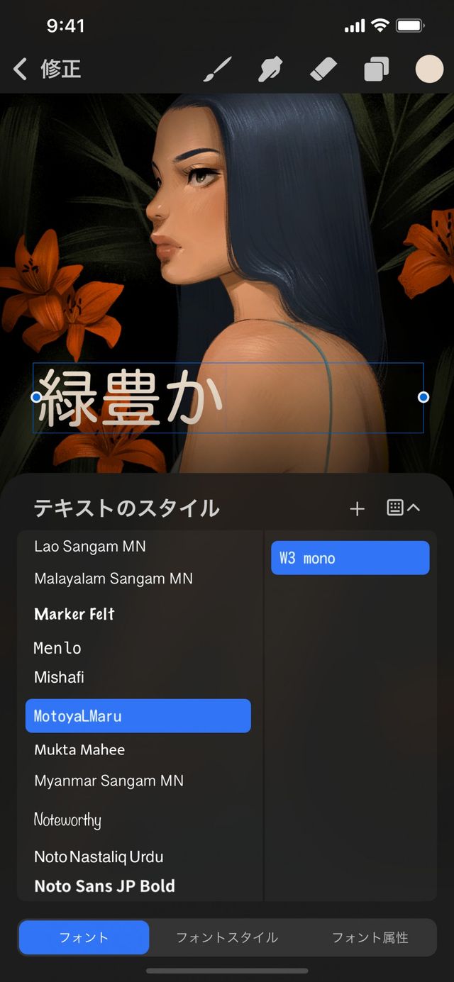 Procreate Pocket では、iOS のすべてのフォントを使用できます。