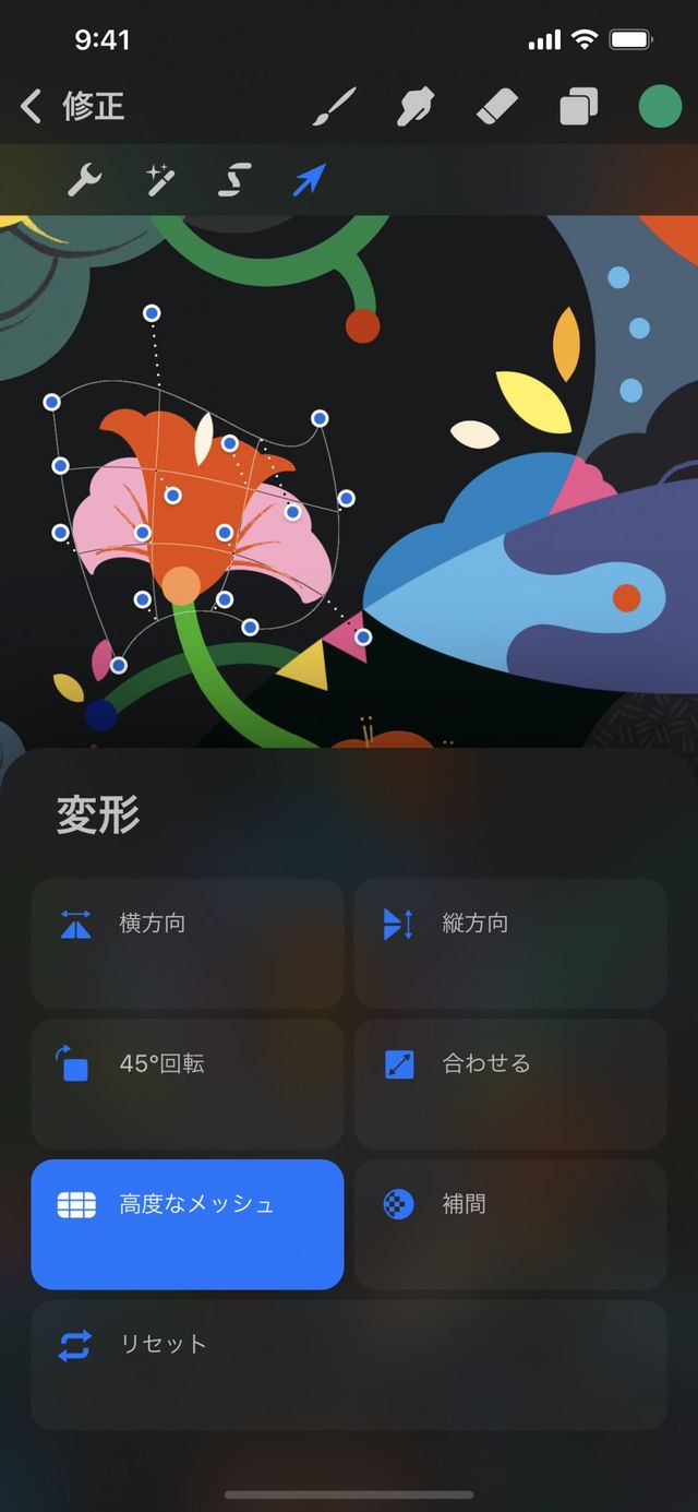 ワープを選択した状態で、設定 > 高度なメッシュ をタップすると、呼び出すノードの数を増やしてより細かく制御できるようになります。