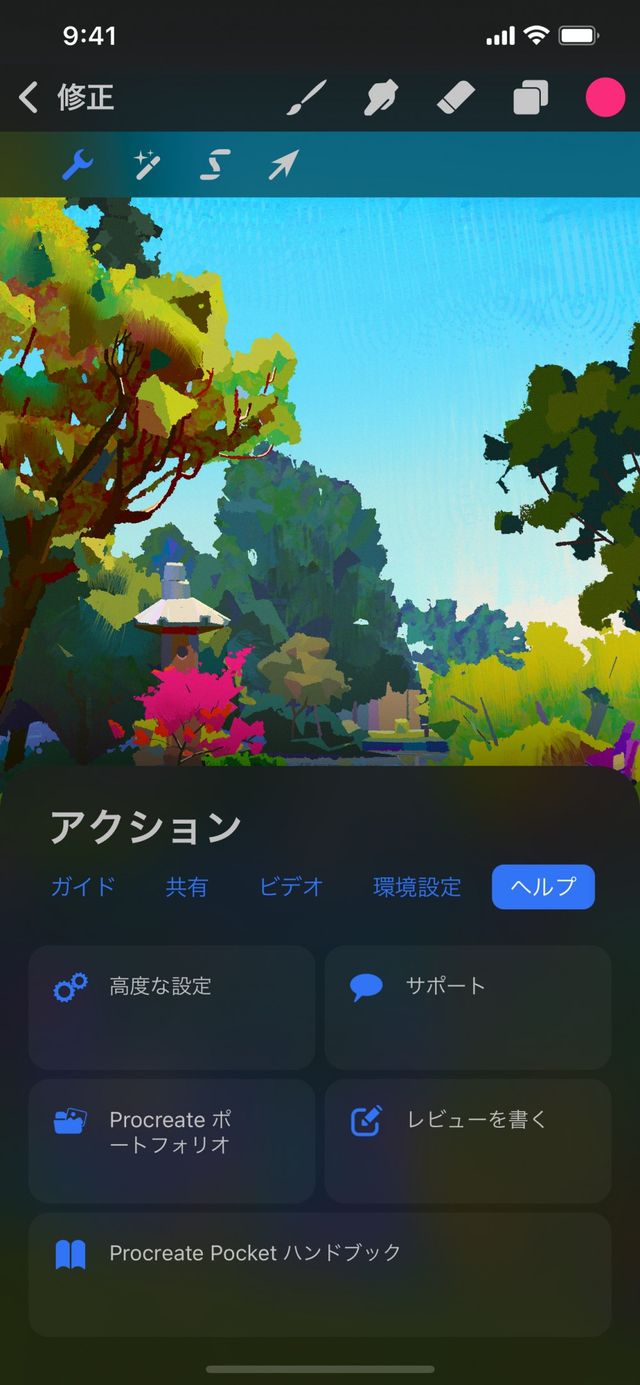 Procreate のアートコミュニティに参加して、自分の作品のオンラインポートフォリオを作成するには、修正 > アクション > ヘルプ > Procreate ポートフォリオ をタップします。