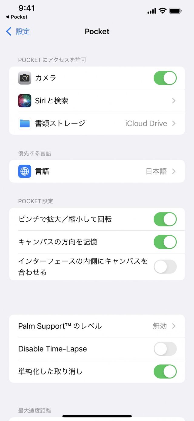 ほとんどの設定は Procreate Pocket 内で調整できます。ただし、一部の設定は、Procreate Pocket のタッチへの反応と iOS がどのように相互作用するかにとって非常に重要なので、このような設定を調整するには、iOS の Procreate Pocket 設定セクションに移動する必要があります。修正 > アクション > ヘルプ > 高度な設定 をタップして、iOS の “設定” に移動します。ここから、以下の中心的な機能を調整できます。