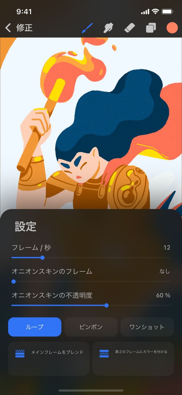 Procreate Pocket のオニオンスキン機能も同様の機能を提供します。現在のフレームの前後にあるフレームが表示されるので、アニメーションの概要がわかります。