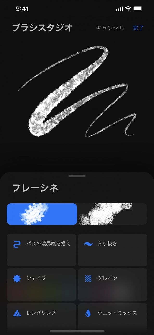 ブラシスタジオには 2 つの方法で移動できます。既存のブラシをタップして編集するか、ブラシのライブラリで “新規ブラシ” をタップします。いずれの方法でも同じブラシスタジオインターフェイスが表示されますが、1 つだけ違いがあります。“新規ブラシ” をタップしてブラシスタジオに移動したときだけ、“読み込む” ボタンが表示されるという点です。