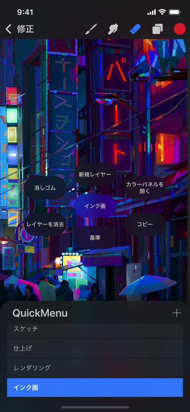 これは、創作の過程ごとに異なるアクションを使用する場合に便利です。たとえば、スケッチとそれに色を付ける工程で QuickMenu に異なるアクションを割り当てることができます。そのような場合、スケッチ用の QuickMenu プロファイルと、色付け用の QuickMenu プロファイルを別々に設定します。