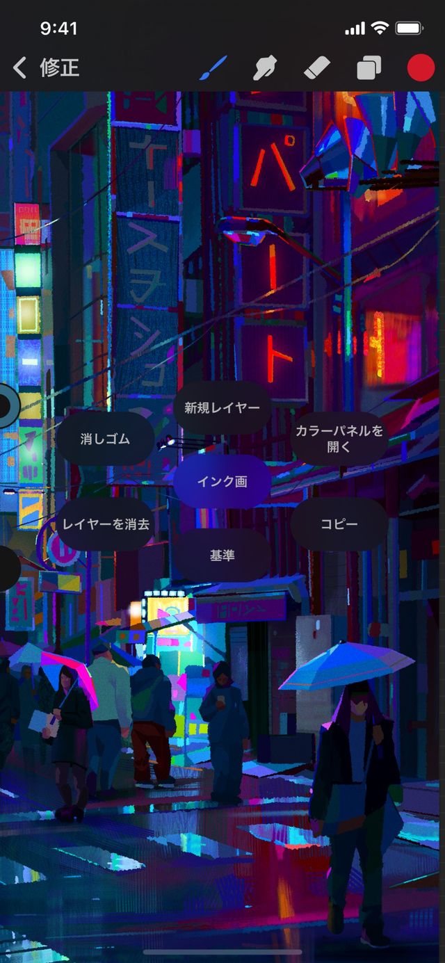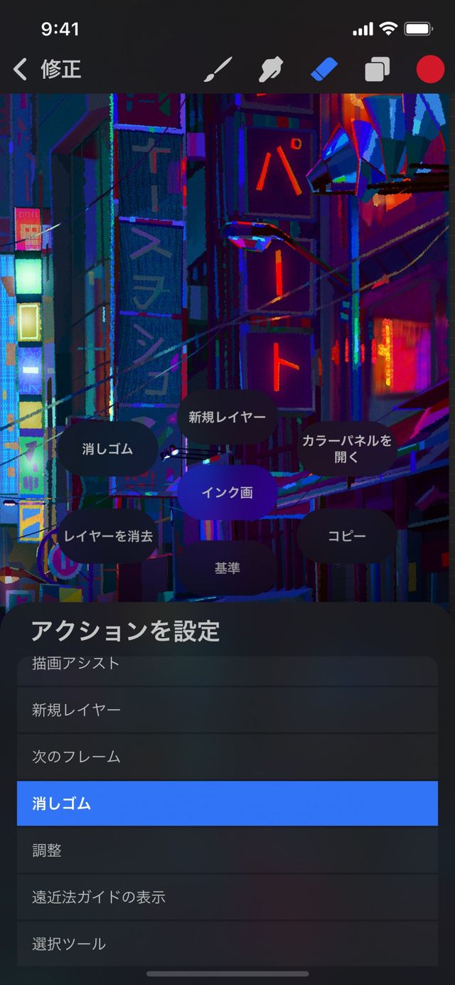これらのボタンの機能を、よく必要とする Procreate Pocket の機能に変更できます。それには、QuickMenu を呼び出してから、変更するボタンを押さえたままにします。しばらくすると、“アクションを設定” メニューが表示されます。オプションの一覧をスクロールして、目的のアクションをタップします。