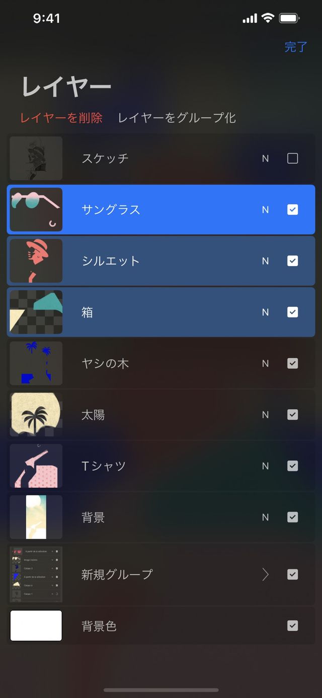 これをタップすると、選択レイヤーが 1 つのグループにまとめられます。