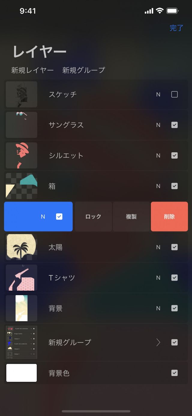 レイヤーまたはレイヤーグループを右から左にスワイプすると、頻繁に使用する以下の 3 つのオプションのボタンが表示されます。