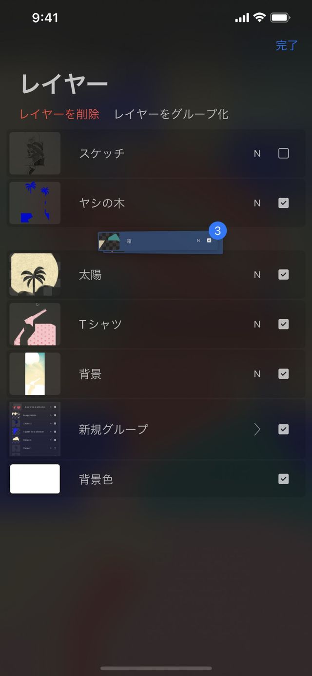 レイヤーをタップして押さえたままにしてつかんでから、他のレイヤーもタップして一緒につかみます。別の指で 完了 > ギャラリー のボタンをタップします。