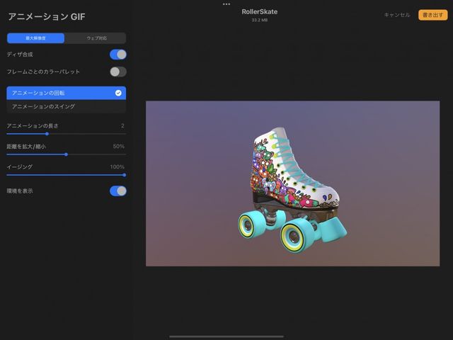 アニメーション GIF では、3D オブジェクトを回転またはスイングさせて表示することができます。"アニメーションの回転" と "アニメーションのスイング" をタップして表示し、どちらのアニメーションで書き出すのがよいか決めてください。