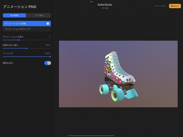 アニメーション PNG では、3D オブジェクトを回転またはスイングさせて表示することができます。"アニメーションの回転" と "アニメーションのスイング" をタップして表示し、どちらのアニメーションで書き出すのがよいか決めてください。