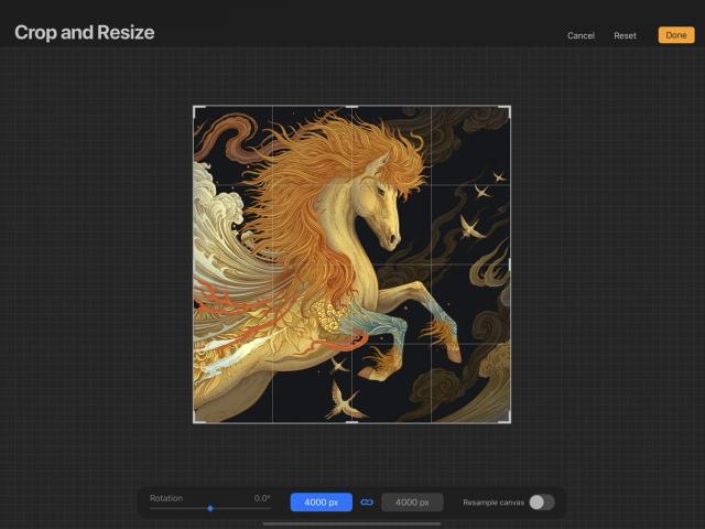 To make your canvas larger, smaller, or a different shape, tap Actions > Canvas > Crop and Resize. Toggle the Resample switch on to begin resizing your content.