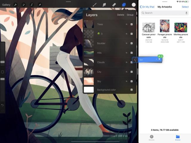 Pick up a layer and drag it to any compatible location to export it as an image. You can export to other Procreate documents, other apps, and any Apple sharing locations such as folders in iCloud or Files.
