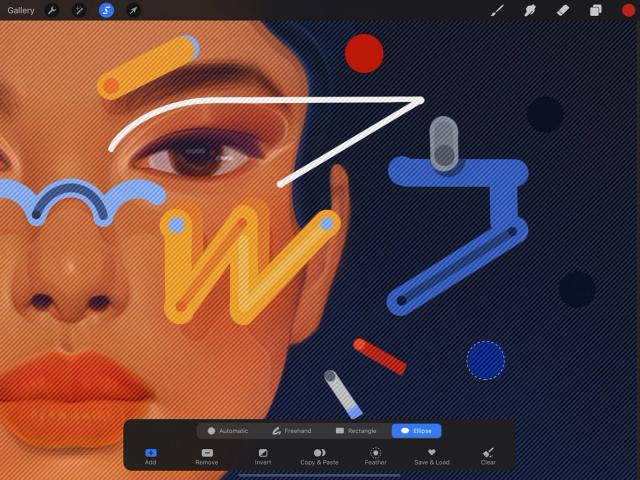 Craft more complex selections by creating multiple ellipses, rectangles, or both, and tap Add to combine them into a single selection. Or, mix and match selection modes freely: start with an Ellipse selection, and hand-draw additions to it using Freehand.