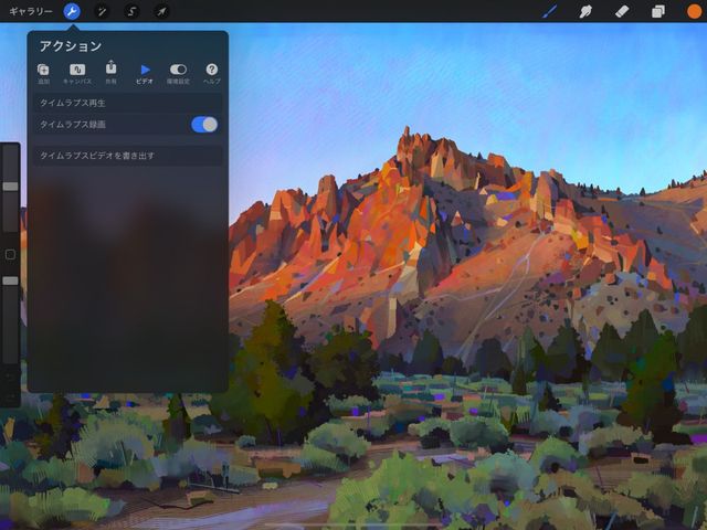 タイムラプスビデオはデフォルトでオンに設定されています。“アクション” の “タイムラプス録画” トグルを使って一時停止できるのは、現在のキャンバスの録画だけです。他のキャンバスやすべての新規キャンバスでは、録画は引き続き行われます。