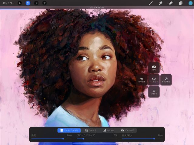 アーティファクト、ウェーブ、シグナル、ダイバージの 4 種類のデジタルグリッチ効果を加えることができます。効果ごとに個別のコントロールを使って、アートワークとの相互作用を調整します。
