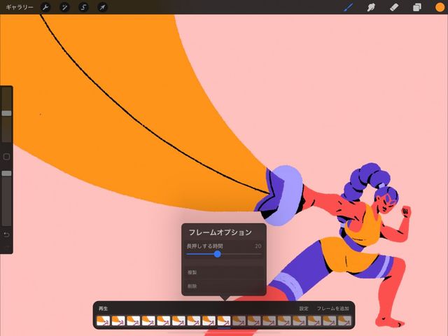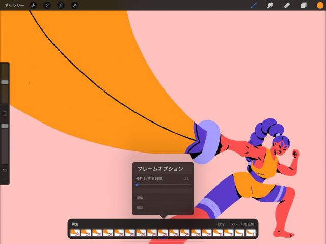 “複製” をタップすると、タイムラインで選択したフレームの横にそのフレームのコピーが作成されます。“削除” をタップすると、そのフレームが削除されます。
