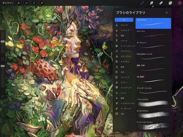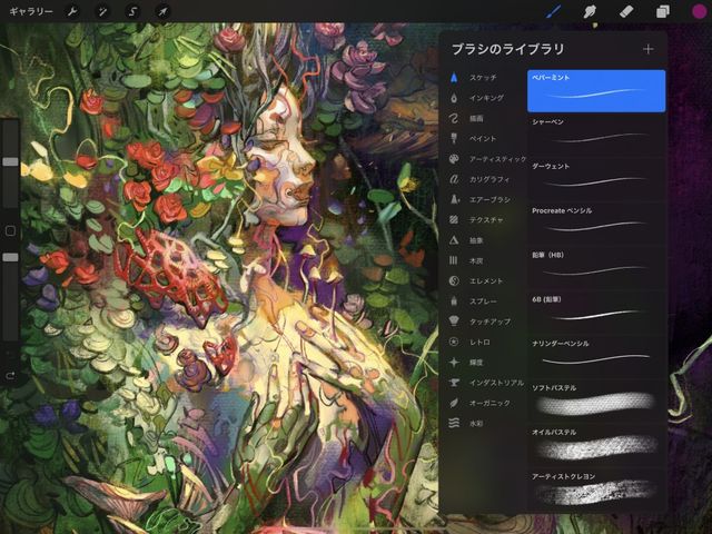 Procreate のブラシにはリアルなものもあれば、幻想的なものもあります。これらのブラシの目的は、アーティストに便利なツールを幅広く提供することです。実用的なものから実験的なものまで多岐にわたるブラシが揃っています。Procreate は、既存のブラシを真似するのではなく、デジタルアートのユニークな強みを生かして、ブラシの持つ可能性を広げることを目指しています。