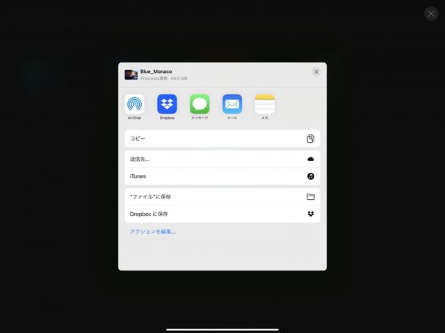 キャンバスでこの “共有” ボタンをタップして、ファイルフォーマットと共有先を選択します。