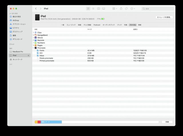 Finder で iPad をクリックしてウィンドウ上部の “ファイル” を選択すると、iPad のアプリのリストが表示されます。“Procreate” を選択して、ディレクトリを開きます。“Fonts”、“ACC”、“Inbox” の 3 つのフォルダが表示されます。