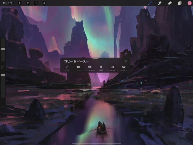 ドキュメントから選択部分を削除して iOS のクリップボードに保存する、基本的なクリップボード機能です。カットした内容は、同じキャンバスの別の場所、別の Procreate キャンバス、または別のアプリにペーストできます。
