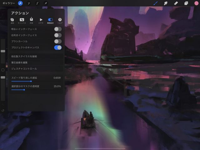 作品を 2 番目の画面に表示するには、アクション > 環境設定 > プロジェクトのキャンバス をタップします。
