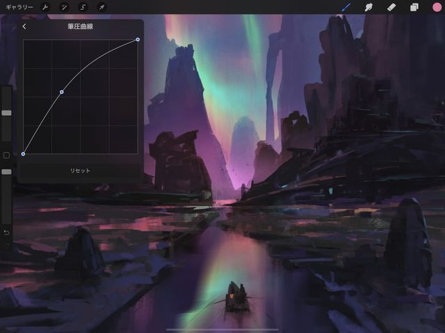 Procreate のカスタマイズ可能な筆圧曲線を使うと、Apple Pencil やスタイラスの使い心地を調整できます。お好みの筆圧曲線を設定すれば Apple Pencil の性能を存分に発揮できます。
