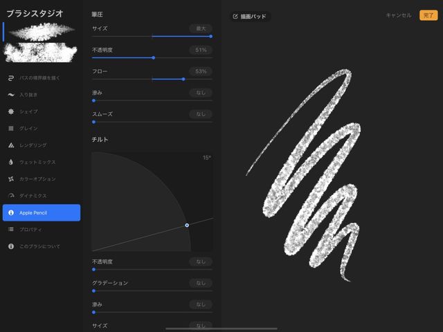 Procreate のブラシは元々、Apple Pencil の筆圧とティルトに反応するように最適化されています。Apple Pencil に対するブラシの反応を幅広く自在にカスタマイズできますが、そのまま使うことも可能です。