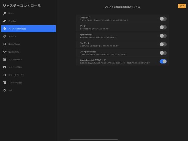 このカスタマイズ可能なショートカットにより、お気に入りの機能を指先一本で呼び出せます。iOS の “設定” の “Apple Pencil” セクションでデフォルトのショートカットを変更します。または、Procreate の 「ジェスチャコントロール」 でカスタマイズ可能なオプションを選択します。