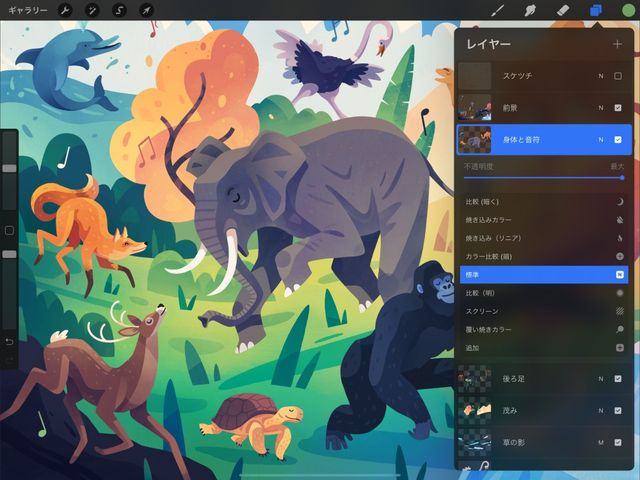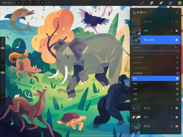 ブレンドモード名をタップすると、選択可能なブレンドモードのスクロール可能なリストが表示されます。スクロールすると各ブレンドモードがレイヤーに適用されるので、その効果をプレビューできます。