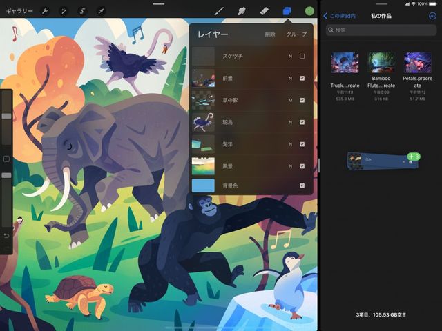 レイヤーをつかんで互換性のある場所にドラッグすると、イメージとして書き出されます。書き出し先としては、他の Procreate ドキュメント、他のアプリ、または iCloud や “ファイル” のフォルダのような Apple の共有場所を選択できます。