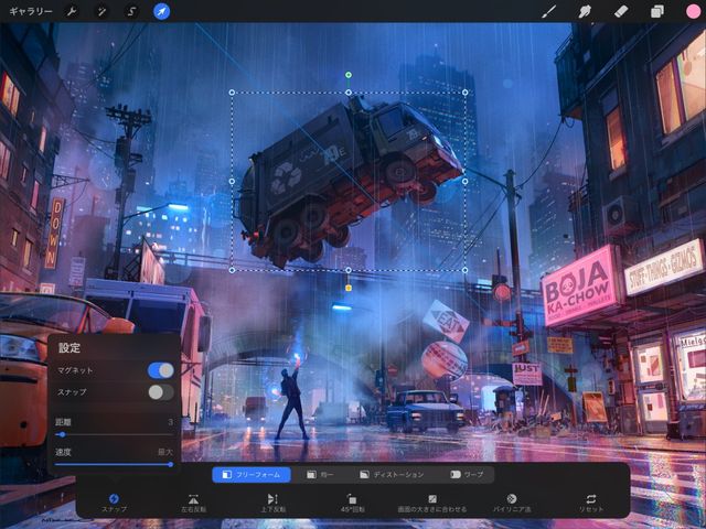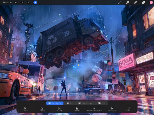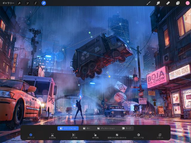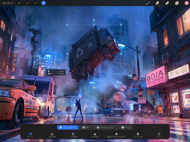 Procreate のフリーフォーム変形モードを使用すると、内容を拡大縮小、回転できます。