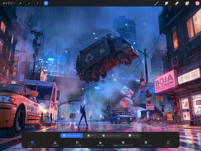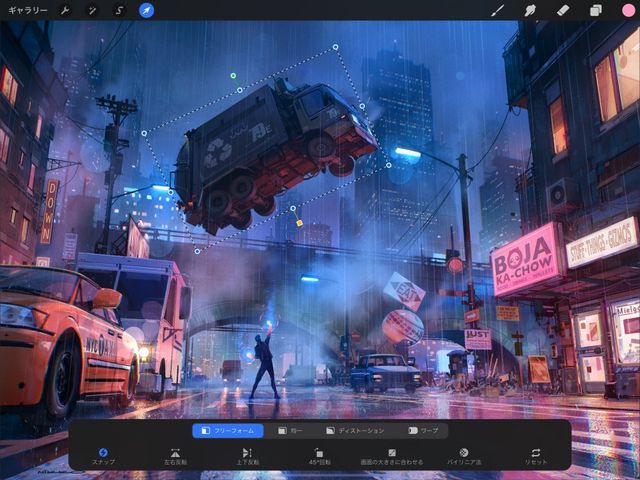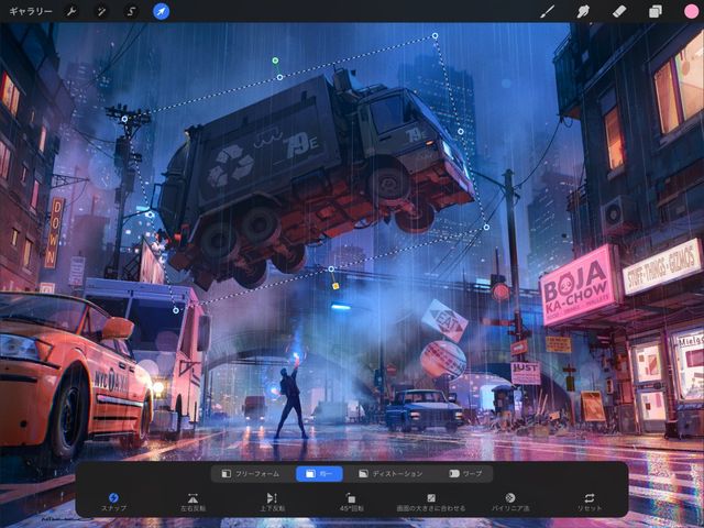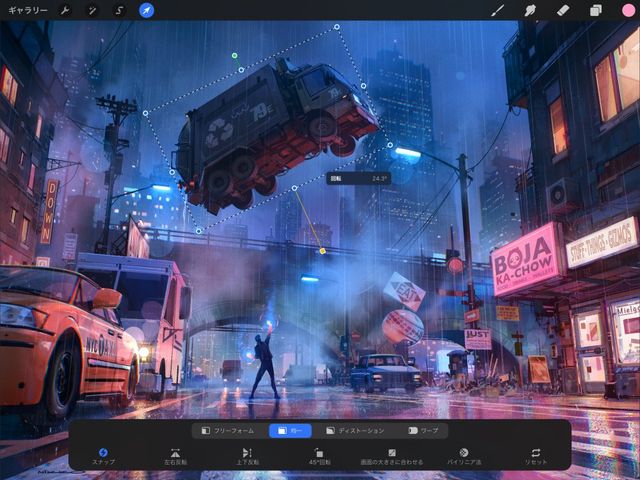 変形ボタンをタップすると、現在のレイヤーの内容が自動的に選択され、変形ツールバーが表示されます。