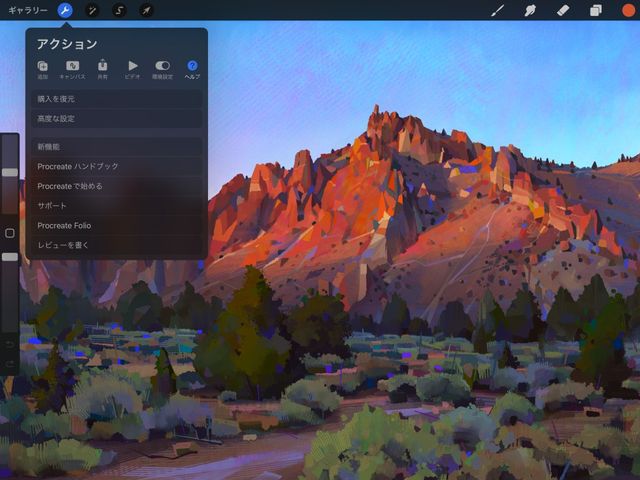 Procreate を再インストールした後やデバイスを新しいものに交換した後に、自分のアカウントに関連付けられている購入内容を復元するには、アクション > ヘルプ > 購入を復元 をタップします。