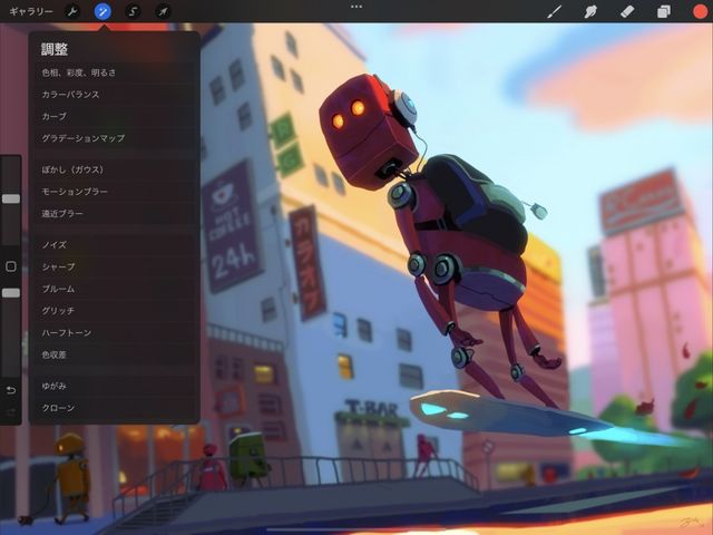 ぼかし (ガウス) でイメージを滑らかにソフトにしたり、モーションブラーを使って高速で動いているような錯覚をもたらしたりすることができます。遠近ブラーを使うと、アートワークに劇的なズーム効果や特定の方向に向かって爆破効果を加えることができます。