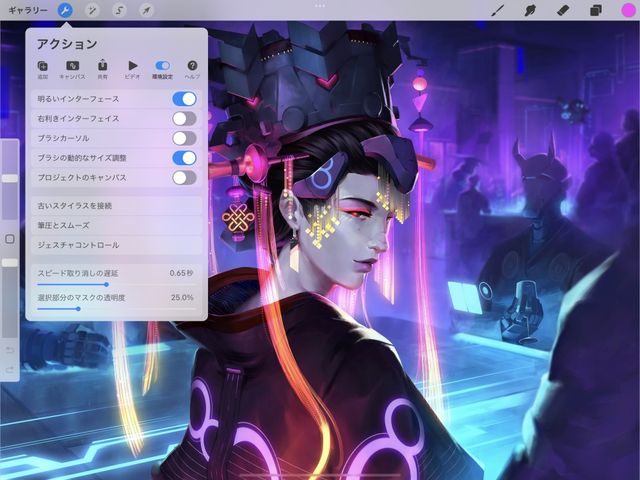 "ダークモード" を選択すると、アートワークに集中するための目立たない黒色のインターフェイスが表示されます。高コントラストの "ライトモード" は、明るい環境での作業に適しています。
