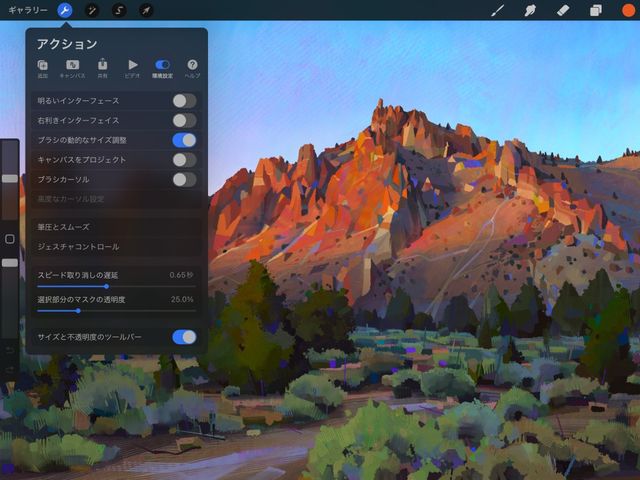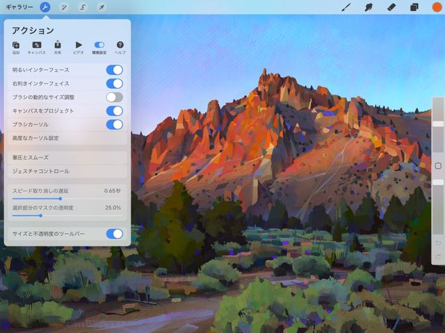 Procreate のインターフェイスの外観や動作を変更するには、アクション > 環境設定 に進みます。使いやすいトグルやスライダを操作して変更を設定できます。