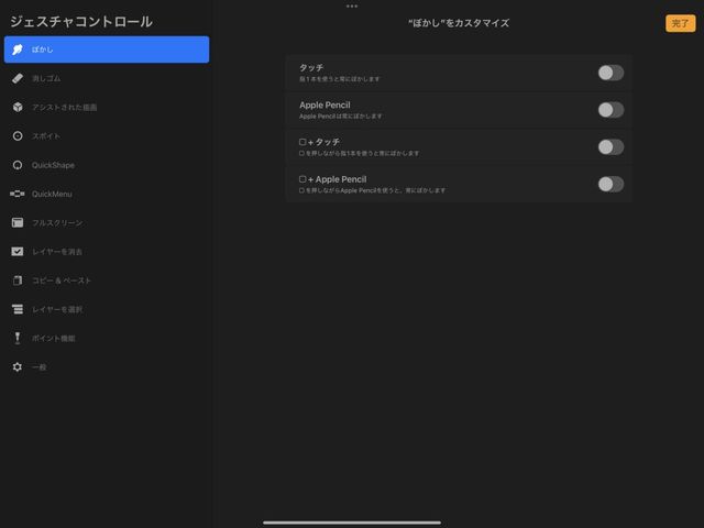 “タッチアクションを無効にする” をオンにすると、今後、指をタッチしたときにジェスチャショートカットの呼び出しのみが行われるようになります。ペイント、ぼかし、消しゴムなど、ジェスチャショートカット以外の操作は指ではいっさい行えなくなります。