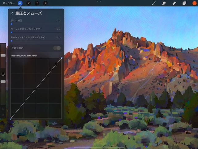 これらの設定にアクセスするには、アクション > 環境設定 > 筆圧とスムーズ をタップします。