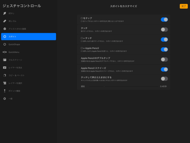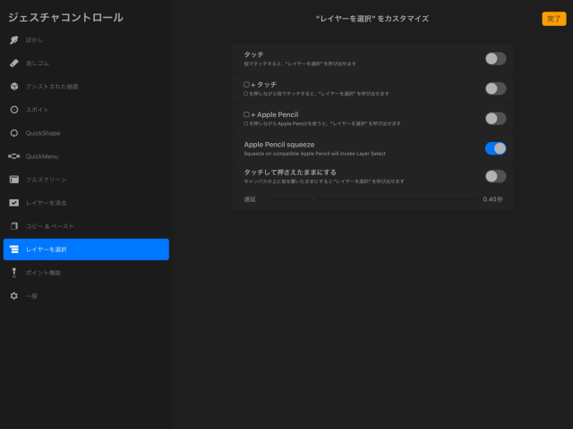 修正ボタンをタップするオプションと、Apple Pencil のダブルタップオプションでは、現在のレイヤーで描画アシストのトグルが切り替わります。