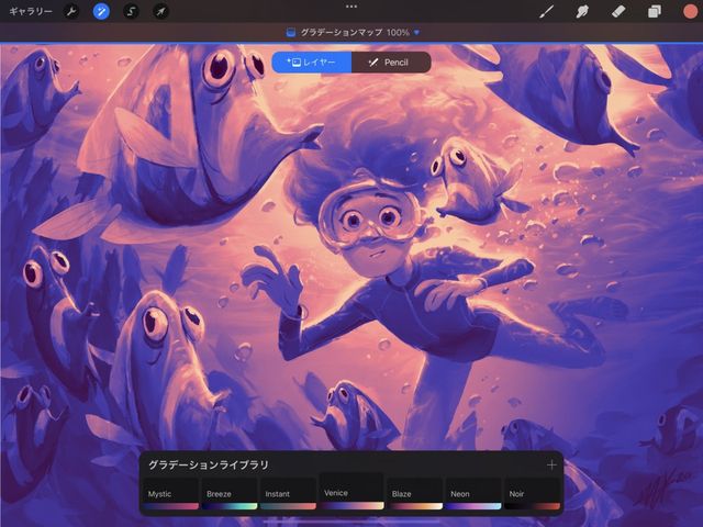 “グラデーションライブラリ” には、イメージに割り当て可能な 8 つのプリセットグラデーションパレット (Mystic、ブリーズ、インスタント、ベニス、Blaze、ネオン、ノワール、モカ) が用意されています。“グラデーションパレット” をタップすると、イメージに割り当てられます。または、“グラデーションパレット” を左右にスライドさせると、プリセットされたさまざまなグラデーションマップを表示して順番にイメージに適用できます。