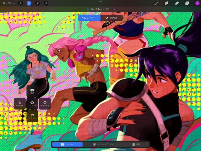 注意: Pencil フィルタは、Apple Pencil でのみ使用できます。ゆがみやクローンの場合は、レイヤーボタンや Pencil ボタンは表示されず、直接、レイヤー調整モードになります。