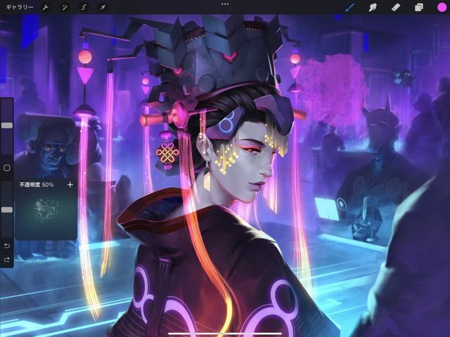 “レイヤー” パネルでレイヤーを 2 本指でタップすると、そのレイヤーがメインになり、“不透明度” コントロールが表示されます。キャンバス上で指を左右にドラッグすると、そのレイヤーの透明度を増減できます。