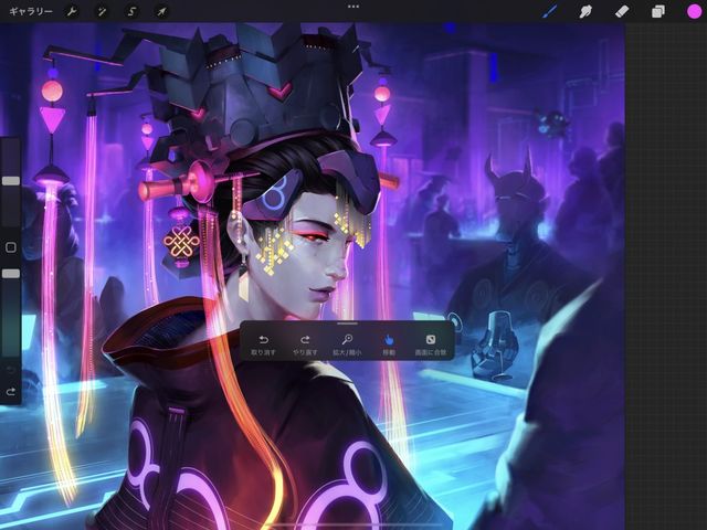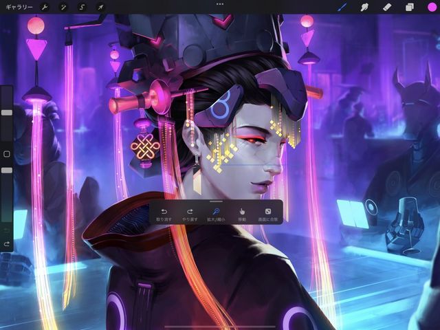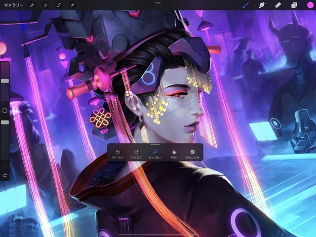 Procreate は、“シングルタッチジェスチャのコンパニオン” によるシングルタッチジェスチャをサポートしています。キャンバス上をフローティングするこのコンパニオンには、“取り消す”、“やり直す”、“拡大 / 縮小”、“移動”、“画面に合致” の各ボタンが含まれています。