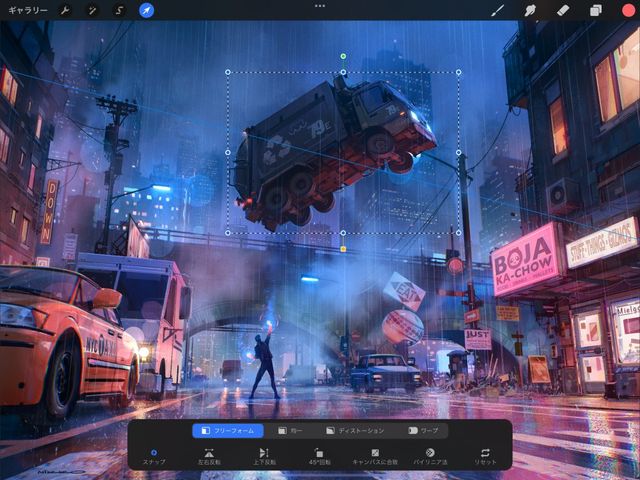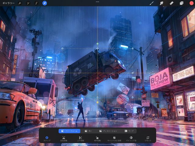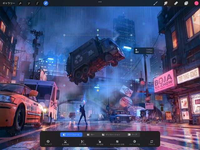 Procreate のフリーフォーム変形モードを使用すると、内容を拡大縮小、回転できます。