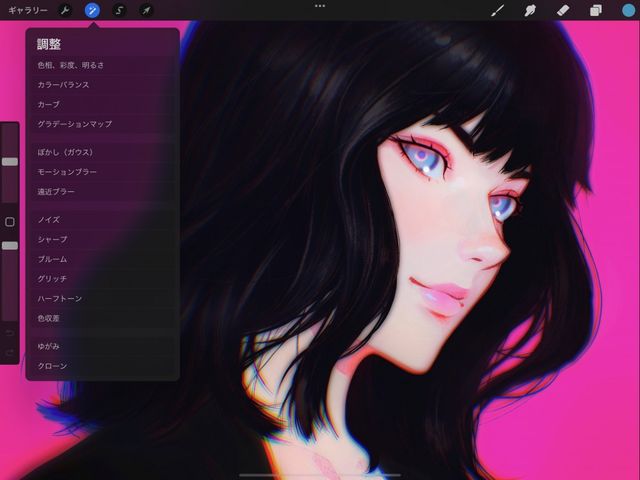 RGB イメージの赤と青の平面を移動して、カメラレンズの色収差効果を再現します。写真では、この効果は非常にわかりにくく、青または赤のわずかな後光のように見えます。Procreate では、収差の方向と距離を完全に制御できます。これにより、この効果を誇張することができます。