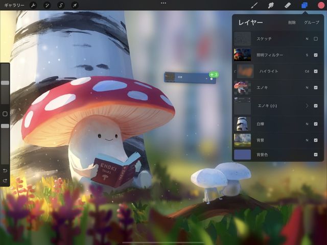 ギャラリーに移動したレイヤーをつかんだまま、別の指で追加先のキャンバスをタップします。引き続きレイヤーをつかんだまま、キャンバスが読み込まれたらレイヤーパネルを開き、つかんでいたレイヤーをパネルにドロップします。