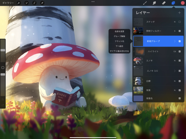 グループしたレイヤーを元に戻したい場合は、レイヤーパネルでグループをタップし、ポップアップメニューで「グループ解除」をタップします。